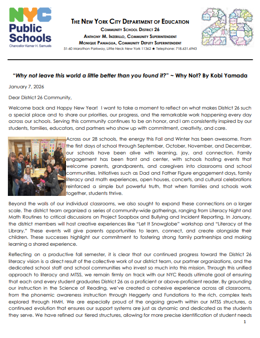 Reflecting on a productive fall semester, it is clear that our continued progress toward the District 26 literacy vision is a direct result of the collective work of our district team, our partner organizations, and the dedicated school staff and school communities who invest so much into this mission. Through this unified approach to literacy and MTSS, we remain firmly on track with our NYC Reads ultimate goal of ensuring that each and every student graduates District 26 as a proficient or above-proficient reader. By grounding our instruction in the Science of Reading, we’ve created a cohesive experience across all classrooms, from the phonemic awareness instruction through Heggerty and Fundations to the rich, complex texts explored through HMH. We are especially proud of the ongoing growth within our MTSS structures, a continued evolution that ensures our support systems are just as dynamic and dedicated as the students they serve. We have refined our tiered structures, allowing for more precise identification of student needs and more effective small-group interventions. This growth ensures that our instructional priorities aren't just goals, but lived experiences for our students.