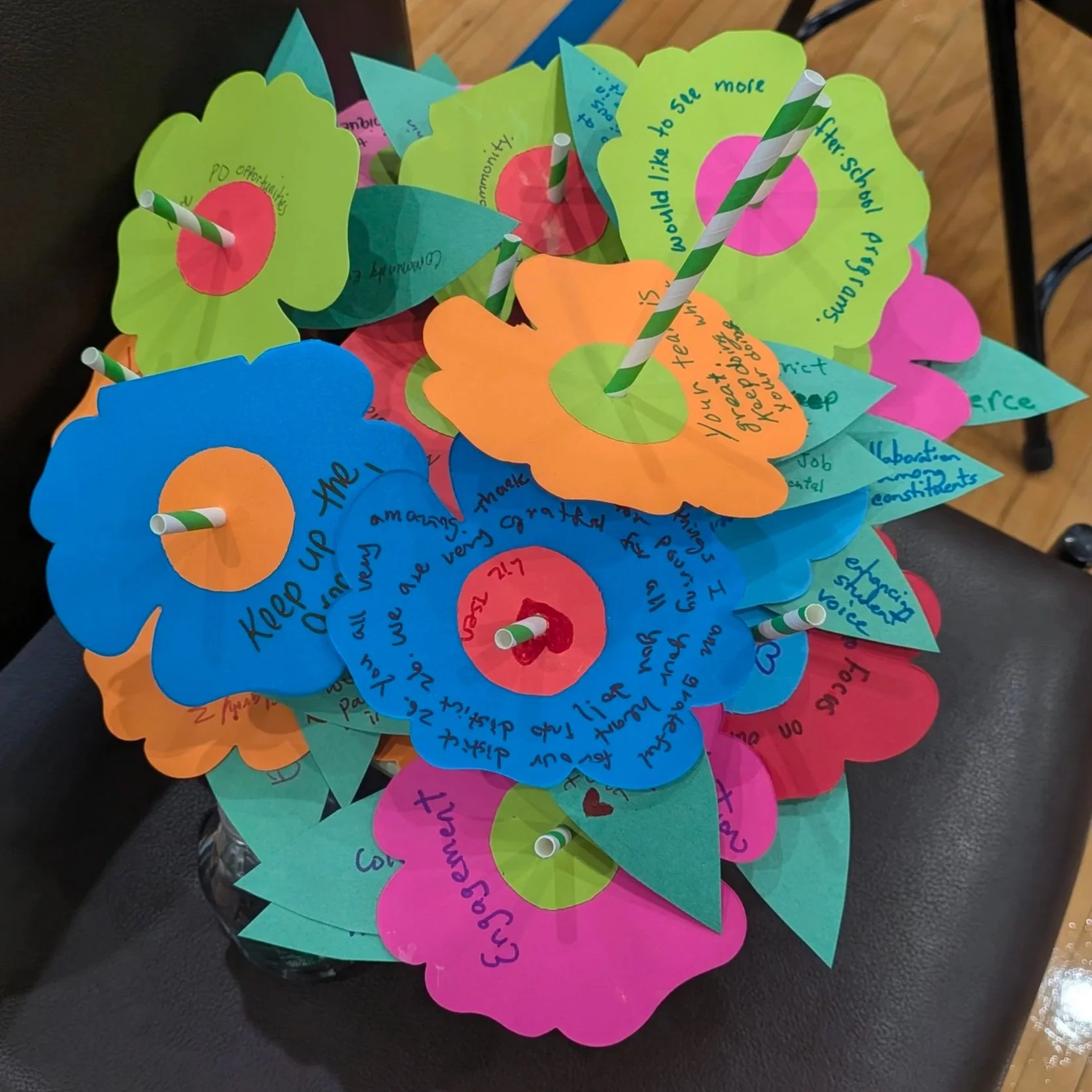 In that same spirit of kindness and community, members of the district team engaged families and community members in a reflective activity that invited them to share their thoughts about District 26. Together, we spent time highlighting the great things happening across the district, recording celebrations such as the positive focus on community, as well as our hopes for the future on the leaves of paper flowers, including continuing to consider the unique needs of all learners. Thank you to everyone who brought such positive energy, thoughtfulness, and care into the room.